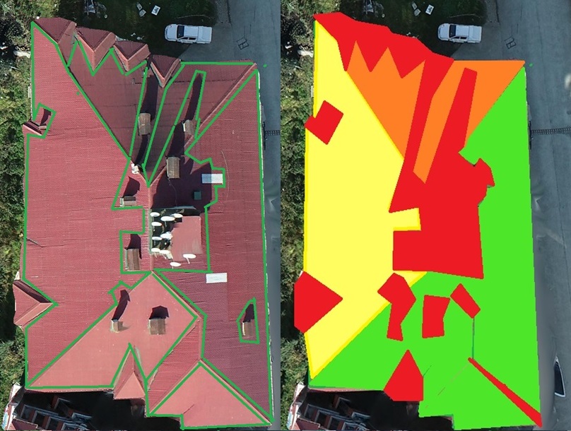 Bina, fabrika vb. tüm yapıların çatıları drone verileri ile 3 boyutlu modellenerek, çatı üzerine çıkılmadan uygun yüzeyler, çatı eğimleri, kurulması planlanan paneller için en uygun yön eğim hesaplamaları ve panel kurulumuna engel olabilecek detaylar (baca, anten vb.) otomatik tespit edilmektedir.